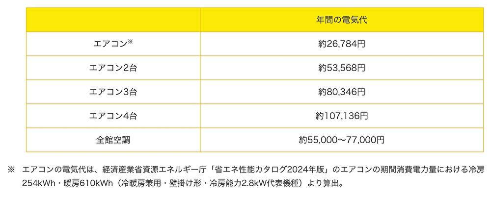 以下は通常のエアコンと全館空調の年間電気代を比較した画像です。
