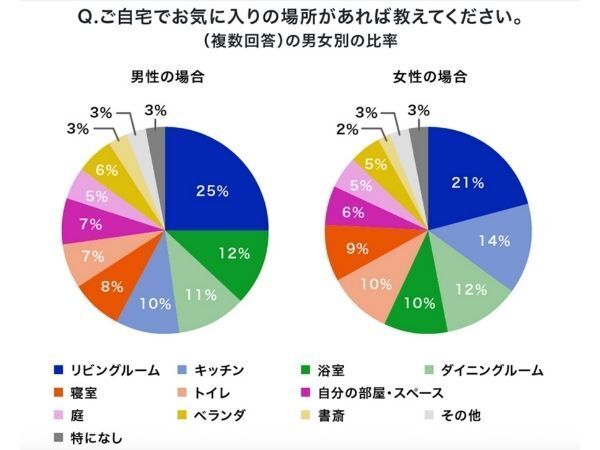 実際、大和ハウスが自宅にあるお気に入りの場所について男女別でアンケート調査をした結果のグラフでも、LDKとお風呂は性別に関係なく好評なのが見てわかりますね。